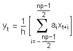 Savitzky-Golay Filter - CoefficientsThe following equation defines the general filter equation according to Savitzky and Golay. The particular behavior of the filter can be incfluenced by chosing appropriate filter coefficients. Thus one can generate both the moving average filter, the polynomial fit, and the smoothed derivatives simply by adjusting the coefficients of this equation. The parameter np defines the number of data points used for the smoothing.