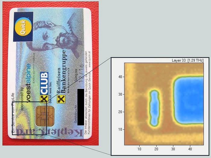 | Left: Photo of bank card. Right: Single wavelength image at 1290 GHz; the microchip and the coupling coil can be clearly recognized (blue areas), the antenna coil which is embedded along the egde of the card is visible in pale brown-yellow colors. Data and photo courtesy H. Pühringer, Recendt GmbH, Linz. |