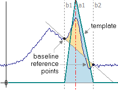 Significant positive correlation (level of significance = 0.01) with a triangle template peak, multiplied by the signal area. Please note that this descriptor is set to zero if the correlation is either negative or not significant. The signal area is calculated by subtracting the area below the baseline from the integral between the reference points b1 and b2. The height of the triangular template peak is always 1.0, its shape is controlled by the points [b1,0], [a1,1], and [b2,0]. |